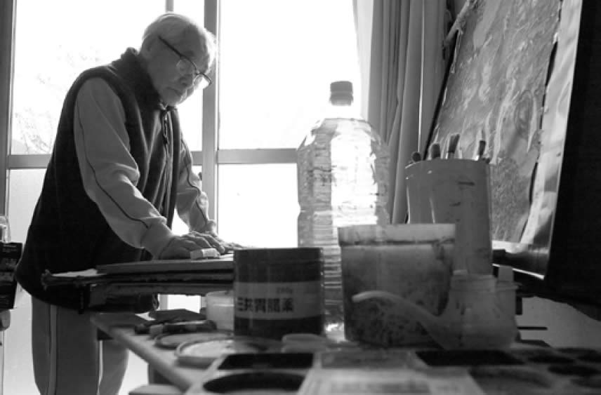 温水園の園長から水彩絵具を贈られ、83歳で絵を描き始める。 以後、没年まで由布院の風景や人物画の製作に自室で取組む。 |